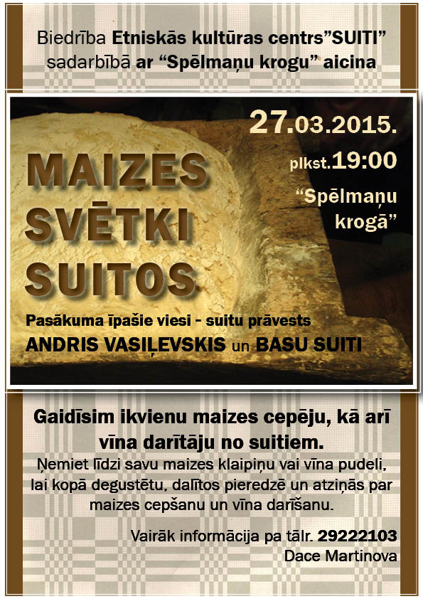 27. martā biedrība sadarbībā ar „Spēlmaņu krogu” organizēja „Suitu maizes svētkus” . Pasākuma mērķis bija pagodināt sūrā un svētīgā daba darītājus – maizes cepējus. Pasākumā piedalījās suitu maizes cepēji un savu maizīti degustācijai atvēlēja – Irēna Hartmane, Ingrīda Jēkabsone, Krišs Danenbergs - Dambergs, Mareta Petroviča, Margrieta Smidrovska, Inese Valciņa, Mairita Slavinska, Spodrīte Vente un Inta Demme. Degustējam arī Marijas Pūteles un Emīlijas Kolnas sklandraušus, kā arī Margrietas Smidrovskas rudzu cepumus. Bet, lai maizīte „nenosprūstu”, pasākumā arī tika aicināti vietējie vīna darītāji. Jāsaka, ka mūsu dižās saimnieces ir ne tikai labas maizes cepējas, bet prot darīt dažādu ogu vīnus. Pasākuma īpašais viesis prāvests Andris Vasiļevskis sniedza ieskatu par maizes un vīna sakrālo nozīmi, savukārt Lidija Jansone dalījās atmiņu stāstos par maizi, tās nozīmi ceļā uz Sibīriju. Par pasākuma muzikālo noformējumu parūpējās tradīciju ansamblis „Basu suiti”, kas izdziedāja Ivetas Akeldamas un Lidijas Jansones dziesmas.