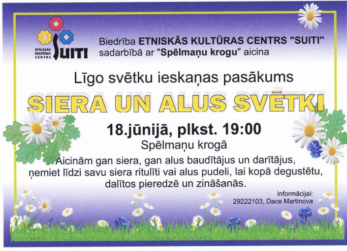 Biedrība sadarbībā ar “Spēlmaņu krogu” Alsungā Līgo svētku priekšvakarā organizēja svētkus suitu siera un alus darītājiem un baudītājiem, lai dalītos ar receptēm, pieredzi un padomiem siera un alus darīšanā. Degustējām arī veikalā nopērkamo sieru un alus šķirnes. Suitu dižsaimnieces Skaidrītes Nagliņas vadībā sējām sieru, ko tad ikvienam bija iespēja nogaršot. Pasākuma goda viesis bija suitu draudžu prāvests Gatis Bezdelīga. Kopā ar prāvestu radām atbildes uz jautājumiem par latvisko rituālu saistību un nozīmi ar katoļu baznīcas sludinātām pamatvērtībām.