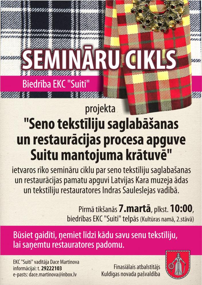 Realizēts pirmais šī gada projekts Kuldīgas novada pašvaldības projektu konkursā „Kuldīgas novada pašvaldības finansējuma saņemšanai kultūras projektiem, biedrību un nodibinājumu darbības atbalstam, kuru darbība saistīta ar kultūras jomu, 2015.gadā” „Seno tekstiliju saglabāšanas un restaurācijas procesa apguve Suitu mantojuma krātuvē”, piešķirtais finansējums 700 Eur. Ar šī projekta palīdzību piesaistījām eksperti - Latvijas Kara muzeja ādas un tekstiliju restauratori Indru Saulesleju. Restauratores vadībā četru semināru laikā interesenti varēja apgūtu tekstiliju restaurācijas un saglabāšanas procesa pamatus, praktizējot uz Suitu mantojuma krātuves rīcībā esošās ekspozīcijas, kā arī saņemt konkrētus padomus līdzpaņemto lietu saglabāšanā. Pašreiz Suitu mantojuma krātuves eksponātu skaits sasniedzis 200. Eksponātu stāvoklis ir dažāds, katram no tiem ir nepieciešams attiecīgs restaurācijas un saglabāšanas process, lai ekspozīcija būtu apskatāma arī nākotnē. Suitu mantojuma krātuves ekspozīcijai ir muzejiska vērtība, un vēl daudz darāmā, lai to savestu pilnīgā kārtībā.