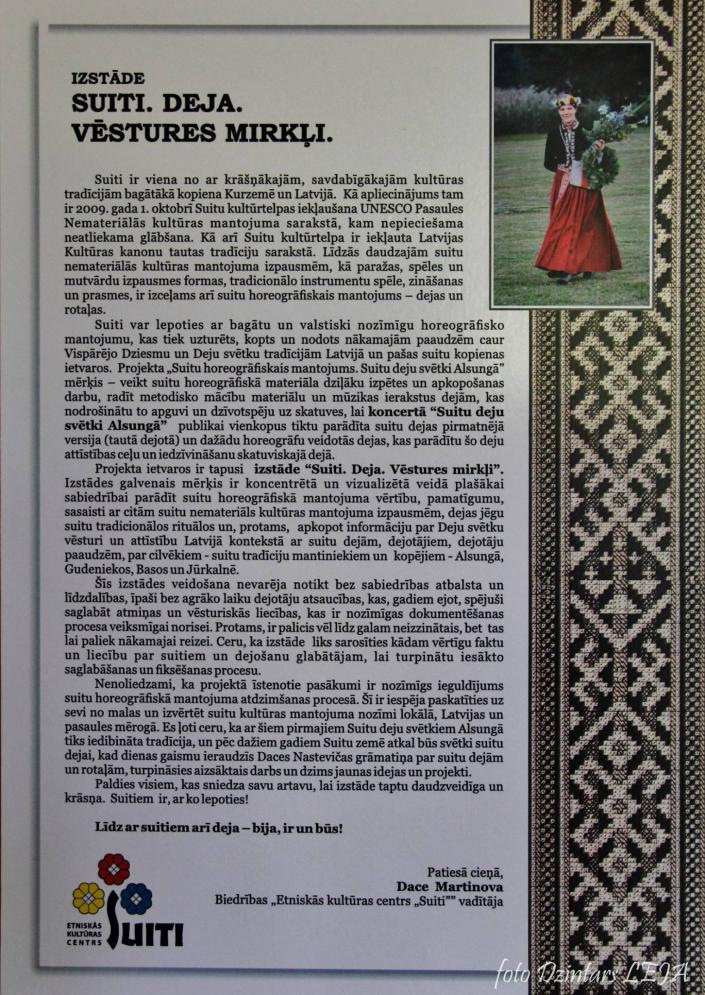 "Tā kā mana aizraušanās ir tautas dejas, nolēmu papildus projektā paredzētajām aktivitātēm veidot izstādi. Uzsākot informācijas vākšanu, zināju, ka darbs būs apjomīgs, jo materiāls jāapkopo gan par Alsungas, gan Jūrkalnes un Basu dejotājiem. Izstādes “Suiti. Deja. Vēstures mirkļi” galvenais mērķis bija koncentrētā un vizualizētā veidā plašākai sabiedrībai parādīt suitu horeogrāfiskā mantojuma vērtību, pamatīgumu, sasaisti ar citām suitu nemateriāls kultūras mantojuma izpausmēm, dejas jēgu suitu tradicionālos rituālos un, protams, apkopot informāciju par Deju svētku vēsturi un attīstību Latvijā kontekstā ar suitu dejām, dejotājiem, dejotāju paaudzēm, par cilvēkiem— suitu tradīciju mantiniekiem un kopējiem - Alsungā, Gudeniekos, Basos un Jūrkalnē."
