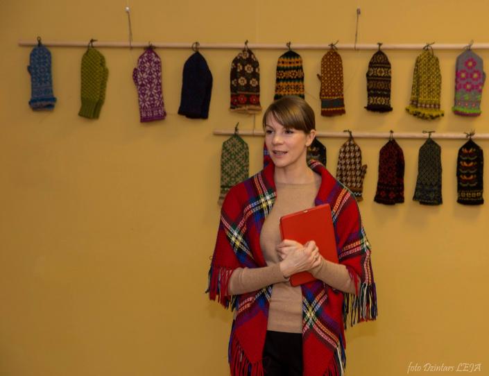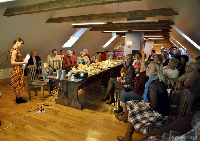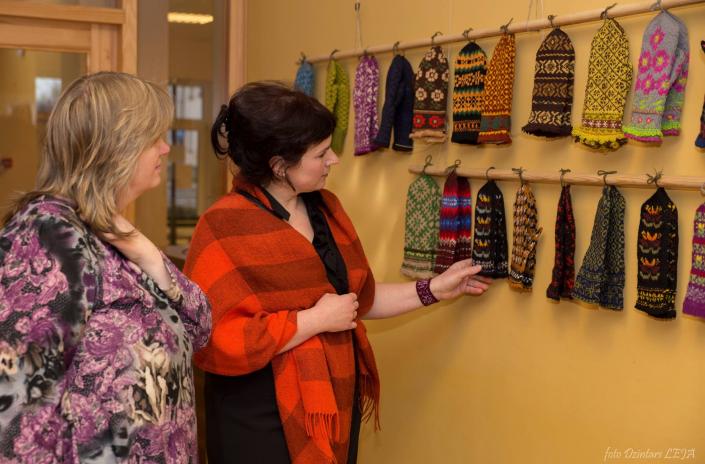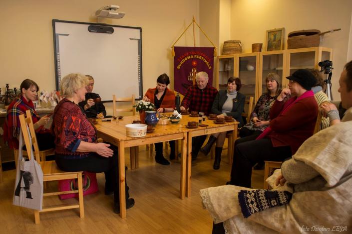 Pēc izstādes atklāšanas rokdarbnieki un visi interesenti pie tējas tases dalījās zināšanās par adīto cimdu vēsturi un dažādajiem rakstiem.