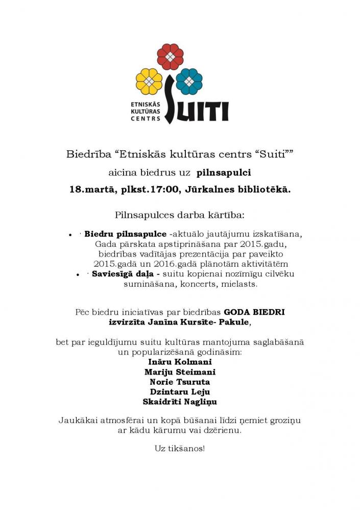 18.martā Jūrkalnes bibliotēkā notika biedrības EKC "Suiti" biedru pilnsapulce. Kā jau ierasts - sirsnīga atkalredzēšanās maģiem, dižiem un krētainiem suitiem, lai atskatītos uz 2015.gadā paveikto un pagodinātu kopienai nozīmīgus cilvēkus.