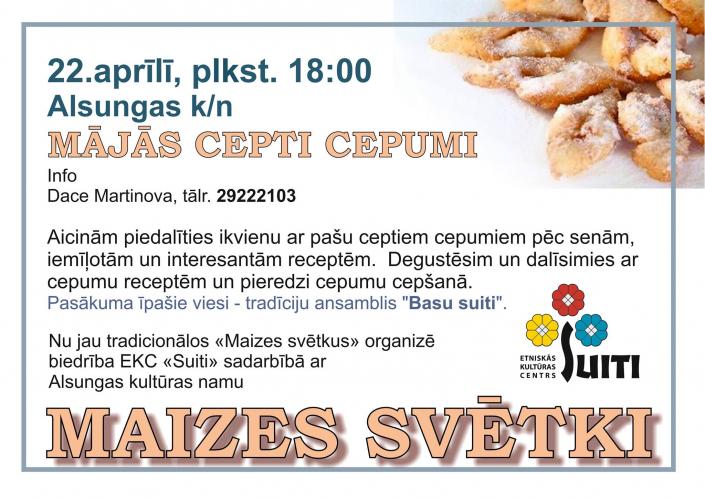 Jau par tradīciju kļuvusi biedrības Etniskās kultūras centrs “Suiti” rīkotie Suitu Maizes svētki. Šoreiz Maizes svētki veltīti mājās ceptiem cepumiem. Saimnieces tika aicinātas piedalīties gan ar sev mīļiem, gan pēc vecmāmiņas receptēm, gan mūsdienīgām receptēm ceptiem cepumiem. Jāsaka, ka interese par cepumiem un vēlme pacienāt ar savu cepumu šķirni bija gan no suitu saimniecēm, gan no blakus novada. Šoreiz degustēšanai savus cepumus bija atnesušas 10 saimnieces, kopumā ap 20 dažādiem cepumiem. Galdā tika celti arī mājās darinātie Dzintara Lejas un Augusta Raģeļa vīni. Gandarījuma sajūta ir liela, jo satikšanās prieks, cienāšanās, dalīšanās pieredzē un atziņās, dziesmas un danči ir tas, kas šodien pietrūkst visvairāk.