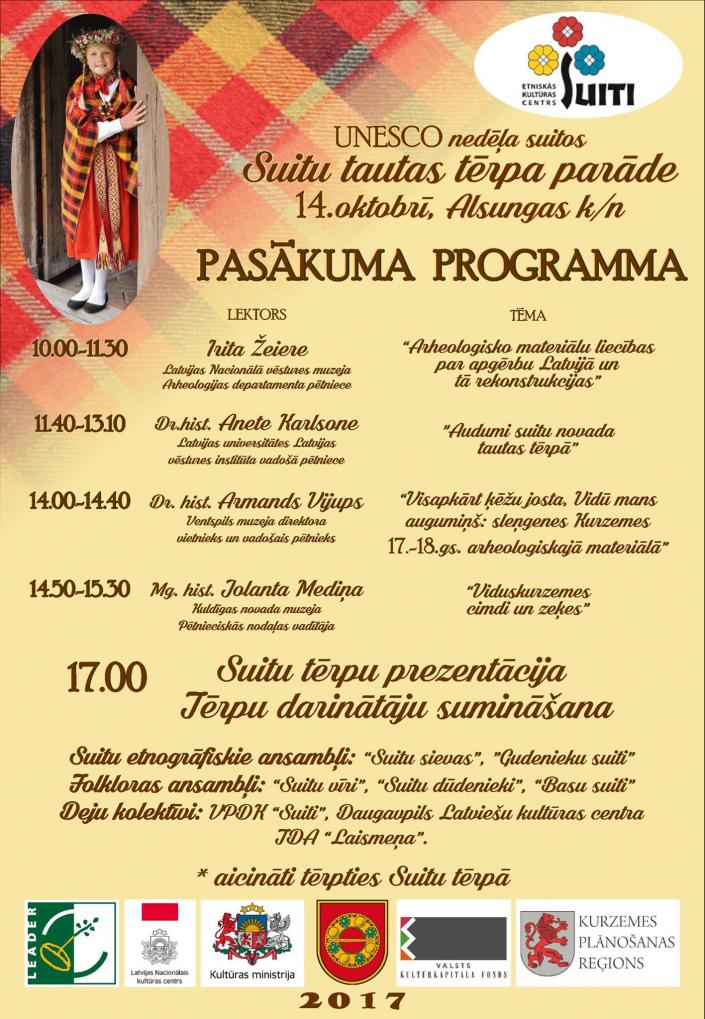 Ik gadus oktobra otrajā nedēļa UNESCO Latvijas Nacionālā komisija izsludina UNESCO nedēļu, kurā aicina ikvienu pievērsties materiālā un nemateriālā kultūras mantojuma izpausmēm. Suitu kultūrtelpa UNESCO paspārnē ir kopš 2009.gada. Šogad Latvijas Nacionālā komisija īpaši vēlējās izcelt kulinārā mantojuma nozīmi un tā sniegtās iespējas ilgtspējīga tūrisma veicināšanai. Suiti šoreiz šai tēmai pieskārās pastarpināti ar kafijas galdu visa pasākuma garumā, galdā ceļot pašmāju meistaru gardumus, bet pasākuma galveno loma dodot suitu tērpam. Tam par iemeslu ir biedrības īstenotais LEADER projekts “Etnogrāfiskā suitu tautastērpa atjaunošana uzvedumam “Suitu kāzas”. Suitu kāzu tradīciju uzvedumu suiti vēlas dāvināt Latvijas simtgadei 2018.gadā, kā spēcīgu tradīciju kopumu, kas ir neizmērojama bagātība gan Latvijas, gan pasaules mērogā. Tāpēc šoreiz UNESCO nedēļā - Suitu tautastērpa parāde, pasākumu kopums – ar izglītojošām lekcijām un dienas noslēgumā ar izrādīšanos un darinātāju sumināšanu.