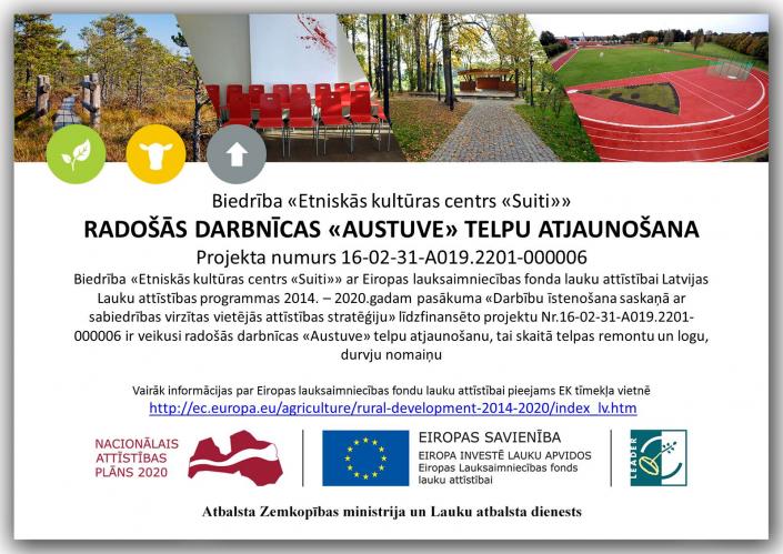 Biedrība "Etniskās kultūras centrs "Suiti"" 2017.gadā īstenojusi Valsts Kultūrkapitāla fonda līdzfinansētu projektu programmā "Tradicionālās kultūras nozares profesionālu nevaldības kultūras organizācijas atbalsts". Piešķirtā finansējuma summa 4000 EUR. Projektā biedrība piesaistīja darbiniekus - sabiedrisko attiecību speciālisti Māru Rozentāli un projektu vadītāju/ radošās darbnīcas "Austuve" vadītāju Daci Martinovu, kā arī tika daļēji segtas sakaru pakalpojumu izmaksas.