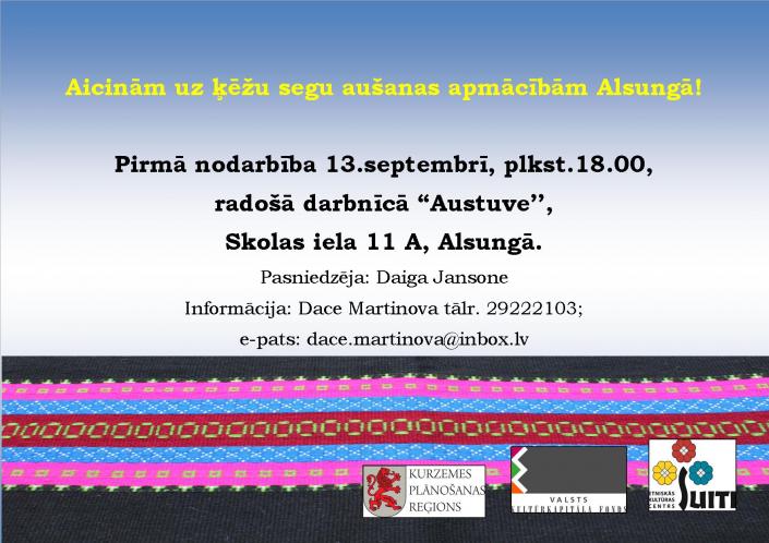 No 26.-30.jūnijam biedrība īstenoja projektu “Tradicionālās kokles un stabules spēles apmācība Alsungā” par pasniedzēju aicinot Andu Ābeli. Nu jau par tradīciju kļuvusi rīkot instrumentu spēles apguvi vasaras periodā nedēļas garumā, kas pēc šāda formāta notiek jau 7 gadu pēc kārtas. Biedrība ir gandarīta par ilgstošo sadarbību ar pasniedzēju Andu Ābeli, kuras zināšanas, radošums un izcilās pedagoģes talants iedvesmo un rosina kokles un stabules spēles apmācībām. Kā ierasts apmācības ik dienas notika trijās grupās – iesācējiem ar un bez priekšzināšanām un pieaugušajiem. Šogad apmācībās piedalījās 20 dalībnieki, kuri noslēguma dienā 30.jūnijā Alsungas kultūras namā pulcēja klausītājus uz koncertu “Dziesmas saulei un jūrai”. Koncertā skanēja nedēļas laikā pagūtais repertuārs, kas galvenokārt sastādīja suitos pierakstītos meldiņus, kā arī dalībnieku atsevišķi priekšnesumi. Paldies par sadarbību Alsungas PII “Miķelītis’’ vadītājai Aletai Lipsnei un Alsungas kultūras namam. Pateicos pasniedzējai un dalībniekiem par radošo nedēļu, skaisto, skanīgo u dvēselisko koncertu un ceram uz tikpat kuplu pulku nākamgad. Projekta finansētājs VKKF Kurzemes kultūras programma - 350 EUR un biedrība EKC “Suiti” – 50 EUR, kopā 400EUR.