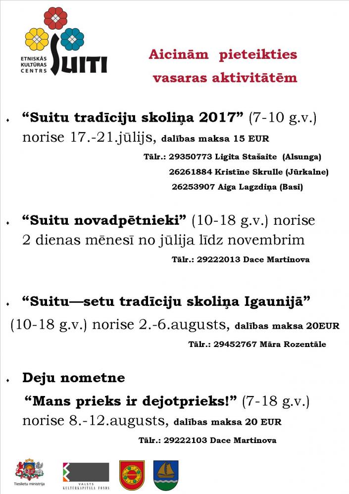 Suitu tradīciju skoliņas 2017 šogad atkal pulcē 30 suitu bērnu, lai piecu dienu garumā iepazītu suitu kultūras mantojuma bagātības. Kopā darbojoties dažādās radošās un izglītojošās nodarbībās rasts priekštats par suitu kultūras daudzveidību un unikalitāti. Apceļojot suitu novadu - maģos, dižos un krētainos suitus, iepazīts suitu dabas krāšņums, dziedāts, dejots un darināts kopā ar tradīciju kopējiem. Finansiālais atbalsts vasaras nometnei no LR Kultūras ministrijas (LNKC), VKKF un Ventspils novada pašvaldības. Paldies skolotājiem un visiem, kas palīdzēja skoliņas norises nodrošināšanā. Uz tikšanos 2018.gadā!