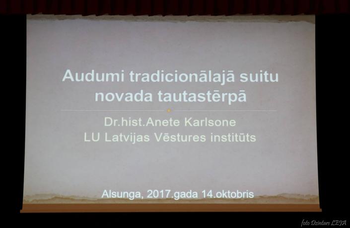 Pirmā no tām “Arheoloģisko materiālu liecības par apģērbu Latvijā un tā rekonstrukcijas”, lektore Irita Žeiere Latvijas Nacionālā vēstures muzeja Arheoloģijas departamenta pētniece, kas ieguldījusi pamatīgu darbu, lai izzinātu senāko gadsimtu apģērbu, tā darināšanas un valkāšanas tradīcijas. Protams, suiti vēlējās sadzirdēt mūsu pusē raksturīgāko apģērbu iezīmes 12.-13.gadsimtā. Otrā lekcija "Audumi suitu novada tautas tērpā", lektore Latvijas Universitātes Latvijas vēstures institūta vadošā pētniece Anete Karlsone, kas nekad nav liegusi padomus un dalījusies savā pieredzē visdažādākos jautājumos par tērpu darināšanu un valkāšanu. Trešā lekcija “Visapkārt ķēžu josta, Vidū mans augumiņš: sleņģenes Kurzemes 17.-18.gs. arheoloģiskajā materiālā” par senām rotām mums stāstīja Ventspils muzeja direktora vietnieks un vadošais pētnieks Armands Vijups, bet pasākuma pirmās daļas noslēgumā Kuldīgas muzeja Pētniecības nodaļas vadītājas Jolantas Mediņas lekcija par Viduskurzemes cimdu un zeķu adīšanas un valkāšanas tradīcijām.
