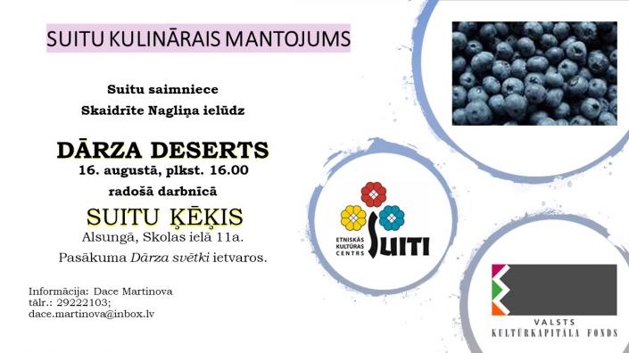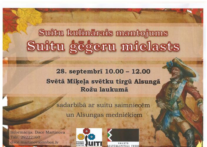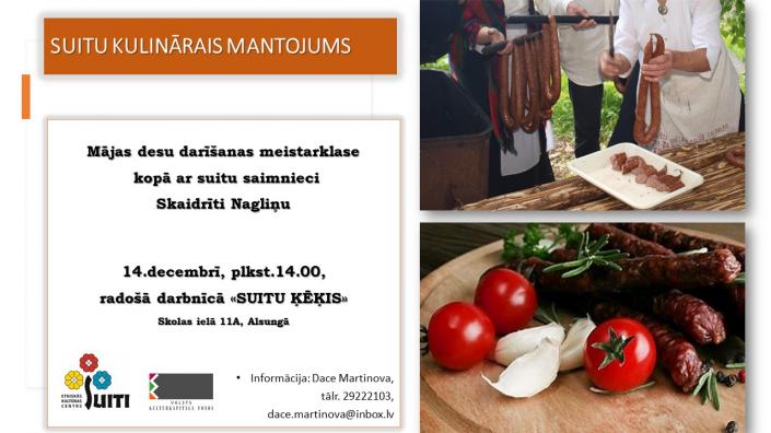 Biedrība EKC “Suiti” 2019. gadā uzsāk 11 pasākumu ciklu, kas veltīts suitu kulināram mantojumam. Katru mēnesi no februāra līdz decembrim ar Valsts kultūrkapitāla fonda finansiālu atbalstu, īstenojot projektu “Biedrības Etniskās kultūras centrs darbības atbalstam 2019. gadā” notiek pasākumi suitu saimnieces Skaidrītes Nagliņas vadībā. Kulināro pasākumu mērķis ir iedzīvināt, arī popularizēt vecmāmiņu gatavotos ēdienus vai produktus, kas savu aktualitāti dažkārt mūsdienās zaudējuši. Suitu kulinārā mantojuma pasākumu tēmas pieskaņotas gadskārtām vai gada ritējumam, kas tajā brīdī no produktiem vai ēdieniem tiek lietots vai gatavots, atbilstoši veicamajiem darbiem vai sezonai. Protams, ēdienu gatavošanā tiek izmantoti jauninājumi, pievienoti papildus produkti un, par pamatu ņemot senās receptes ar bērnības garšu, radīti jauni ēdienu varianti. Projekta gaitā tiek dokumentēti gatavotie ēdieni – pierakstītas receptes un veidots foto materiāls. Kvalitatīva foto materiāla izveide ir fotogrāfa Dzintara Lejas ziņā. Receptes ik pa brīdim tiek publicētas www.delfi.lv/tasty/ un aktivitātes dzirdamas Radio Skonto Kurzeme. Pasākumos var piedalīties ikviens interesents, nāk un nogaršot, dalīties savā pieredzē un ēdienu receptēs, kā arī var piedalīties ar savu gatavoto ēdienu atbilstoši pasākuma tēmai. Pasākumu galvenā mājvieta ir radošā darbnīca “Suitu ķēķis” Alsungā, skolas ielā 11A.