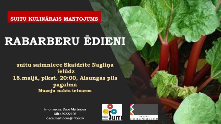 • Rabarbers ir viens no pirmiem ēdamiem augiem, kas izaug dārzos. Rabarberu dzimtene ir Ķīna, tas plaši izmantots medicīnā, vēlāk arī lietots kulinārijā. Vēlāk tas izplatījies Eiropā un Amerikā. Pirmās atmiņas no bērnības saistās ar tikko norautu rabarbera kātu, ko iemērcot cukurā kāri notiesājis ikviens lauku bērns. Arī Latvijā rabarbers ieņēmis paliekošu vietu kulinārā mantojuma pūrā. Populārākās rabarberu receptes ir – plātsmaizes, kūkas, rabarberu klimpas, ķīselis, rabarberu ievārījums vai sīrups. No rabarberiem vāra ievārījumus, jaucot ar ogām, augļiem vai garšaugiem. Rabarberi sader arī ar gaļas ēdieniem, tos var izmantot skābumam, piemēram, citrona vietā. No rabarberiem gatavo vīnu un bezalkoholiskos dzērienus. Rabarbers visgaršīgākais ir tieši maijā, kad tā kāti ir vissulīgākie un mīkstākie. Suitu pusē vispopulārākie ēdieni ir rabarberu klimpas, plātsmaize, ķīselis un rabarberu dzēriens. Dažus rabarberu ēdienus ar bērnības garšu būs iespējams nogaršot 18. maijā, Alsungas pils pagalmā, kurus gatavos suitu saimniece Skaidrīte Nagliņa. Nāciet un nogaršojiet! Rabarbers arī ir tava bērnības garša!