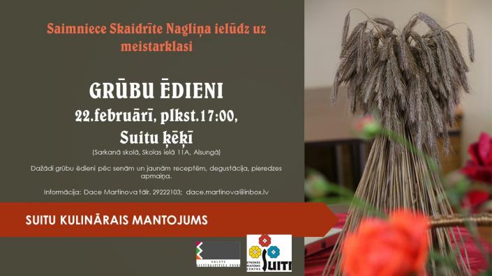 • Pirmais kulinārā pasākums veltīts grūbu ēdieniem. Grūbas, kā graudaugu produkts izsenis tiek plaši lietots vietējā uzturā. Vispopulārākie grūbu ēdieni ir grūbu zupa ar kupinātu gaļu, grūbu biezputra un grūbu pienu zupa. Šoreiz saimniece Skaidrīte Nagliņa galdā ceļ trīs dažādus grūbu ēdienus.