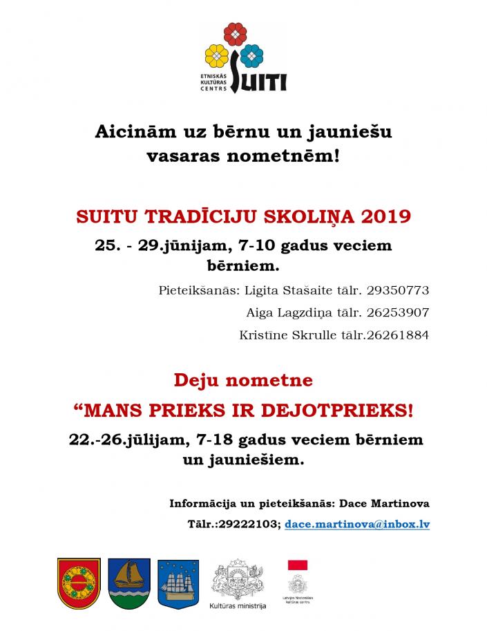 Kopš 2010. gada norisinās dienas nometne “Suitu tradīciju skoliņa”, kurā pulcējās suitu bērni un skolotāji no Alsungas, Jūrkalnes un Basiem, lai izzinātu suitu vēsturi, tērpus, valodu, iepazīt suitu dziedāšanas un muzicēšanas tradīcijas u.c. Šogad “Suitu tradīciju skoliņa 2019” notika no 25. jūnija līdz 29. jūnijam.
