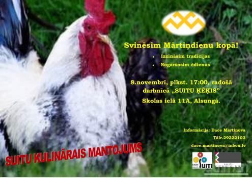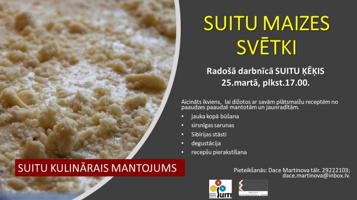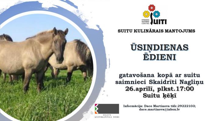 • 26.aprīļa pasākuma tēma ir Ūsiņdienas ēdieni. Radošā darbnīcā Suitu ķēkis, iesaistoties pasākuma dalībniekiem, suitu saimniece Skaidrīte Nagliņa gatavos tradicionālos ēdienus –