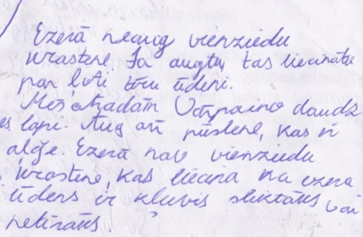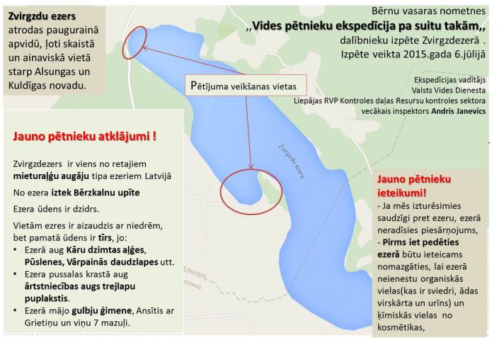 Nometnes pirmajā dienā - "Ūdens dienā" - pētīt ezeru un upju ūdeņus palīdzēja VVD Liepājas RVP kontroles daļas Resursu kontroles sektora vecākais inspektors Andris Janevics. Kopā ar ekspertu tika noskaidrots, kas izraisa ezera aizaugšanu, kurš ir atbildīgs par ūdens tilpņu uzturēšanu kārtībā. Lai noteiktu ūdens tīrību, tika pētīti kukaiņi un augi, kuri aug ūdenstilpnēs.