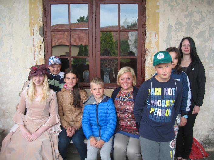 Ekspedīcijas dalībnieku grupa kopā ar pils dāmu Lauru, muzeja vadītāju Ingu un Nadīnas mammu pie pils senākā loga, kas ir izgatavots 18.gs, bet restaurēts 2015.gadā.