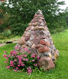 Dace stāsta, ka reiz izlasījusi Imanta Ziedoņa grāmatā par tipisko latviešu lauku sētu – tai vienmēr pret iebrauktuvi pavērsta kūtspakaļa. Tā ir arī Bērziņos. Viņas viens pirmajiem darbiem bijis sastādīt kalnu priedītes, lai tās varbūt kaut kad aizsegtu tipisko latviešu ainavu. Bet pirms vairākiem gadiem viesojoties Norvēģijā, Dace redzējusi no akmeņiem krautas trīsstūra piramīdas, tās sargājot mājas. „Pārbraucu mājās un teicu tētim, ka arī mums tādu vajag,” Dace stāsta. „Viņš jau bija sācis novākt no laukiem akmeņus un bērt lielā kaudzē. Tētis ņēma un vienu sakrāva. Tomēr ziemā sals to sagrāva. Tad nu nācās pārkraut, tikai šoreiz jau samūrēja ar javu. Tētis uzcēla divas, bet trešo uzmūrēju es – pie kapiem.” Dace skaidro, kāpēc tieši trīs: „Tās ir trīs svarīgākās lietas, kas mums ir, pirmkārt, mājas, otrkārt, ceļš uz pasauli, un trešā – kapi, kur katrs reiz tomēr aizies.” Katrā piramīdā ir niša, kurā var iedegt sveci, piemēram, kapu svētku reizē.